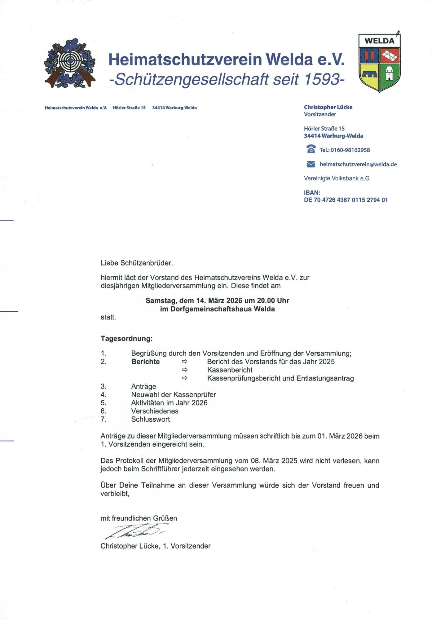 Der Vorstand der Dorfgemeinschaft Welda hatte bereits in der letzten Sitzung im Herbst 2025 verkündet, dass er sich nicht mehr zur Wahl für die nächste 5 jährige Wahlperiode stellen wird. Aufgrund der Umbauarbeiten aber die Geschäfte noch bis zur Fertigstellung der Iberg-Halle und dem neuen Mehrgenerationentreffpunkt weitergeführt.