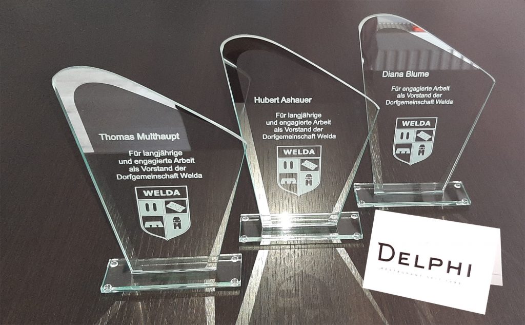 Als besondere Anerkennung überreichte Holger Sprenger seinem Team zum Abschied eine gläserne Harfe mit dem Weldaer Wappen und einer persönlichen Widmung für ihren engagierten Einsatz in der Dorfgemeinschaft Welda.