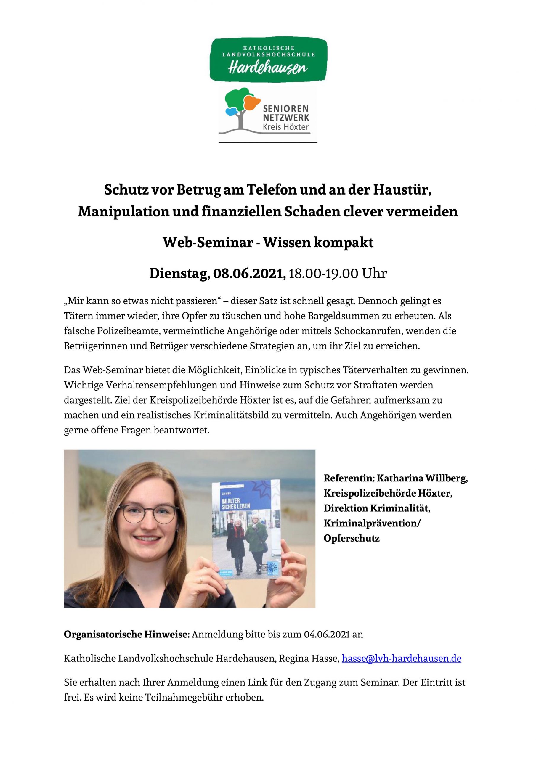 Seniorennetzwerk Kreis HöxterDas Seniorennetzwerk Kreis Höxter führt am Dienstag, den 08.06.2021, in der Zeit von 18.00-19.00 Uhr eine Infoveranstaltung zu Fragen rund um das Thema Betrug an Telefon und Haustür durch.