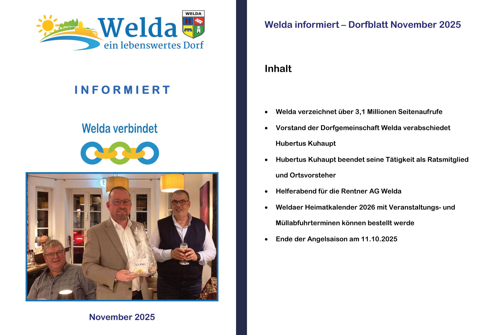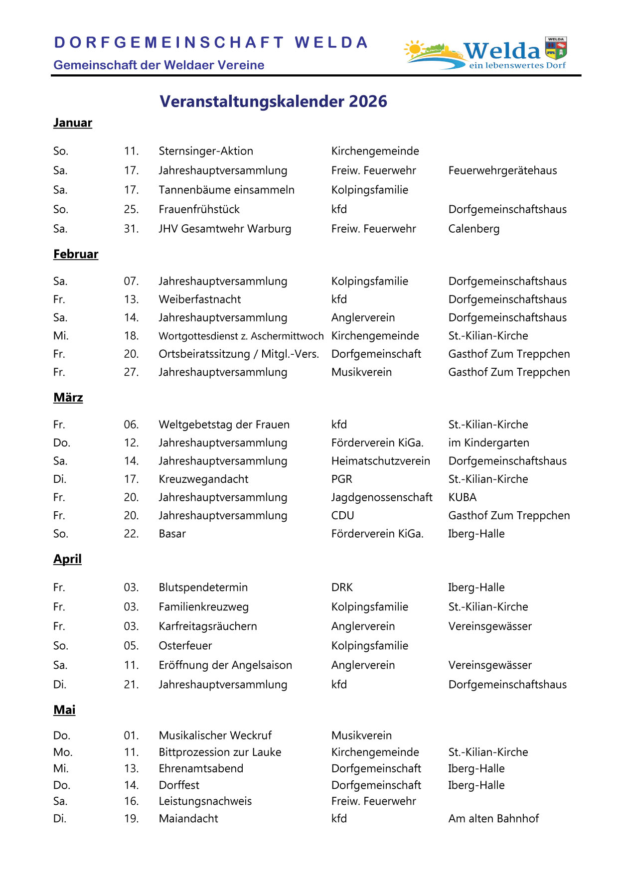 Dorfgemeinschaft Welda gibt Veranstaltungstermine für 2026 bekannt.