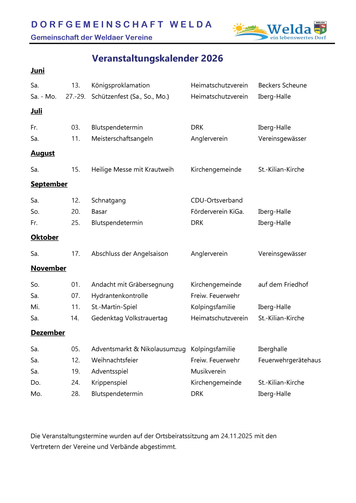 Die Veranstaltungstermine für 2026 wurden auf der letzten Ortsbeiratssitzung am 24.11.2025 mit den Vertretern der Weldaer Vereine und Verbände abgestimmt.