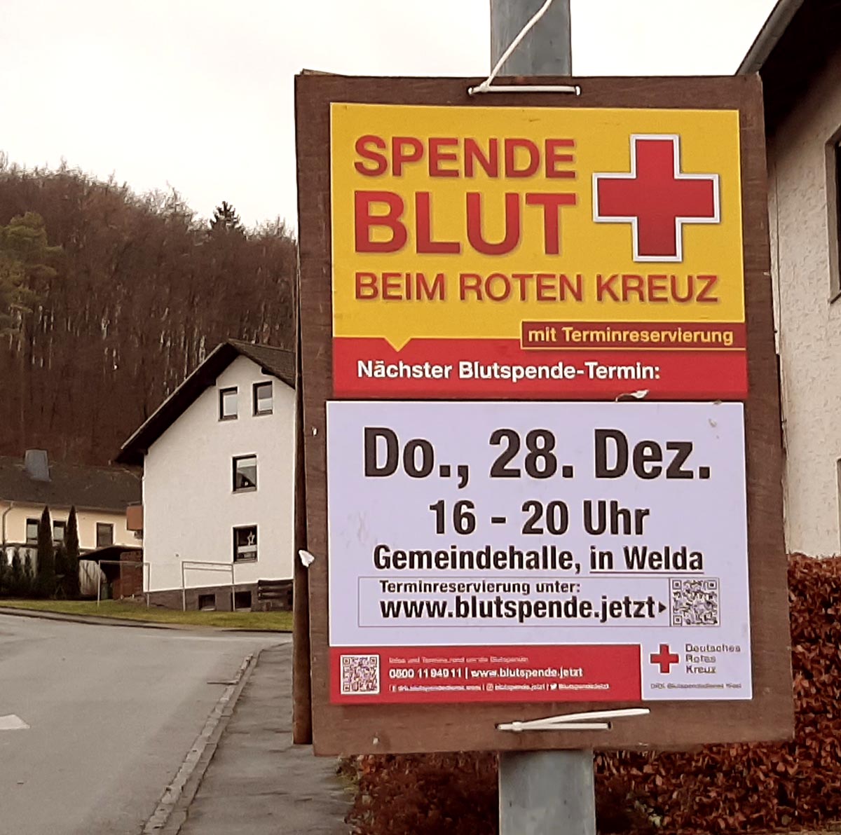 Das Deutsche Rote Kreuz ruft am 28. Dezember 2023 zum Blutspenden in der Iberg-Halle Welda auf.