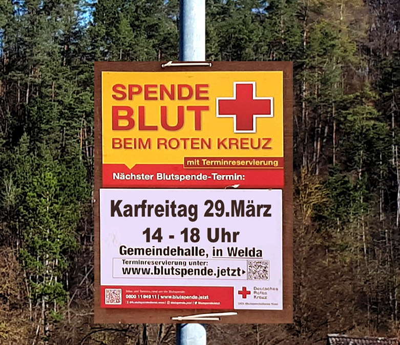 Blutspendetermin am Karfreitag, den 29. März 2024 von 14:00 bis 18:00 Uhr in der Iberg-Halle – Zum Bach 3 – in Welda