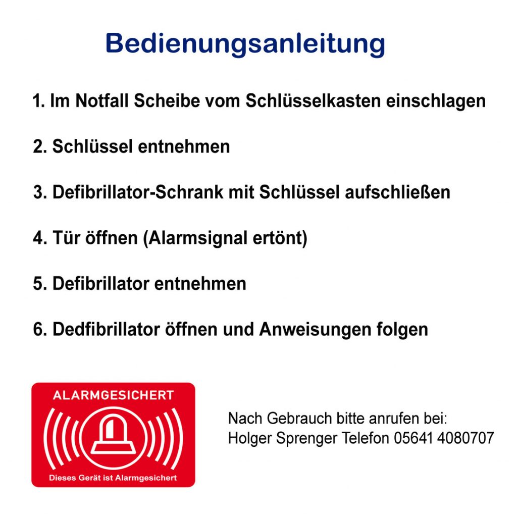 Der AED Defibrillator ist öffentlich zugänglich und gibt automatisch Anweisungen, wodurch er auch von Personen ohne medizinische Vorkenntnisse genutzt und bedient werden kann. Die Eintragung im Defikataster wurde ebenfalls bereits veranlasst.