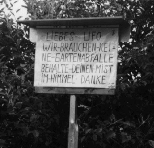 In einem Giobbe lag uppen Komposthaupen hümmer Untüch, wat da nie hingehorde. Dei Nabarn härren et nie druppeschmitten, säget se. Drümme blitt nah der Meinung det Besitzers nur jöbbrig, dat eine UFO-Besatzung da landet sien mutt und den Schitt da hingerlaten hätt.