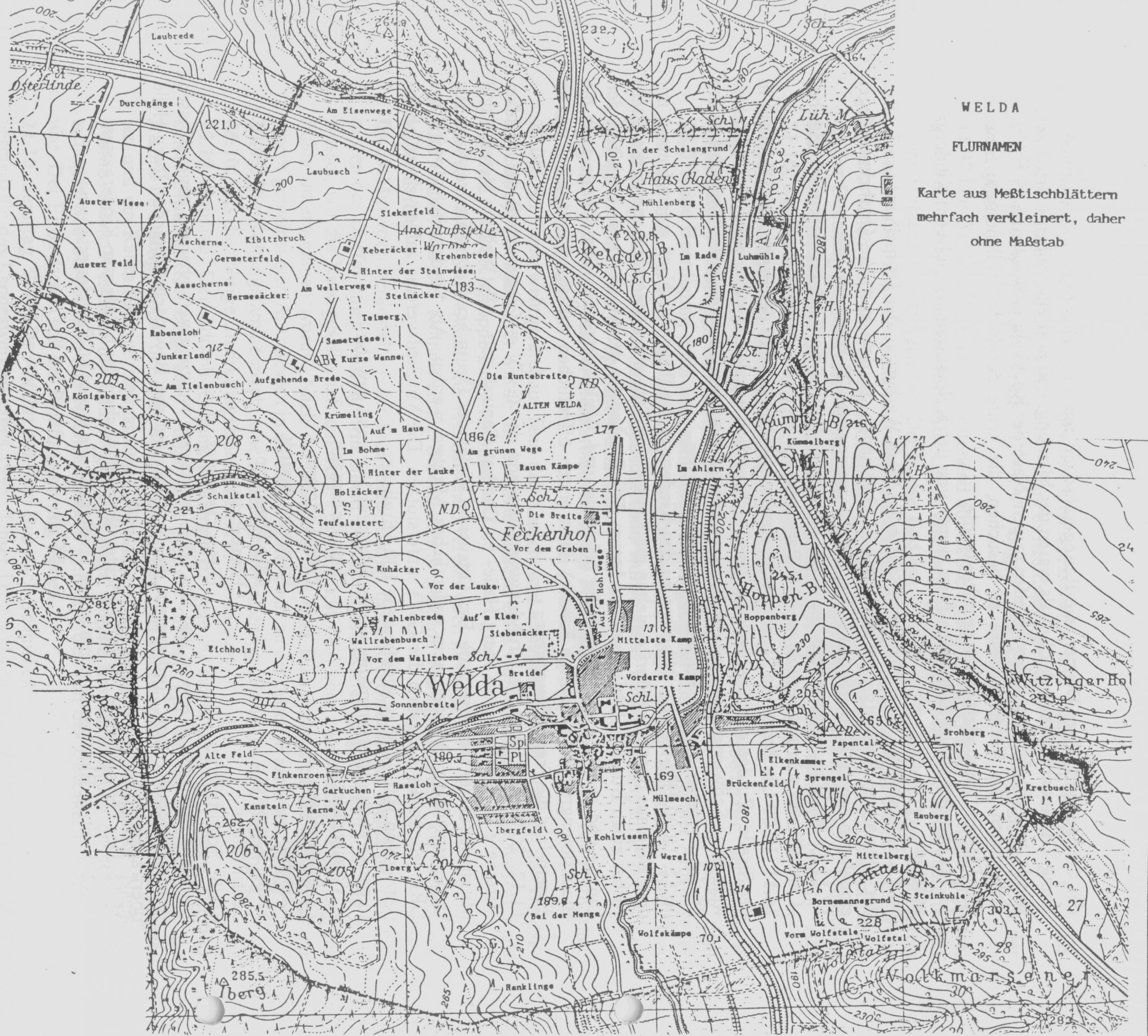 Wo Jungermann´s Garten war, ist nun eine kleine Grünfläche. Welli findet den Mühlenhof mit dem Dreschkasten nicht mehr. Dafür steht heute dort der Betrieb Obersiebrasse, der Wasserkraftanlagen herstellt. Aber dahinter das E-werk, früher Zentrale genannt, ist noch da. Welli geht nun in Richtung Kirche und stellt fest, daß Schwanken Haus nicht mehr da ist. Die Straßen sind alle sauber gepflastert. Als Welli dem Geruch nachgeht, findet er sogar noch zwei Misten. Er weiß noch, daß es früher in Welda fast vor jedem Haus eine Miste gab. Nun ist er wieder auf der ehemaligen Hauptstraße. Köchers [1] Haus und daneben Kampen Haus sehen noch aus wie früher. Nur auf der anderen Straßenseite vermißt er die Kastanienallee. Doch halt, wo ist denn Post´s Haus geblieben, das war doch ein schöner alter Bruchsteinbau mit Sprossenfenstern und einer alten Haustür. Sollte das der Putzbau mit den einflügeligen Fenstern und der neumodischen Haustür sein? Er erinnert sich, daß dort, wo jetzt ein Parkplatz mit einem Grünstreifen und einem Telefonhäuschen ist, früher Todt´s Haus stand. An der rechten Straßenseite vermißt er vor Schmitten[2] Haus die beiden großen Bäume mit den Bänken vor der Haustür, auf denen sich früher die Jugend oft ein Stelldichein gab. Auch gegenüber auf dem früheren „Hauplatz“ standen Bäume, bevor Josef Gemmeke sein Haus baute. Er erinnert sich, daß von der dortigen großen Esche 1929 die Brüder Heinz und Franz Temme abgestürzt waren. Wo jetzt die Metzgerei Kollmann steht, lag früher der Hof Bowinkelmann, später Fecke, danach Josef Tegethoff. Bei dem Hof war eine Wiese mit Obstbäumen. Bewundernd blieb er vor dem „Diekmeister“ Haus stehen. So schön hatte er es nicht in Erinnerung. Am Haus Trilling (Kampe) gegenüber konnte er nicht mehr das große Einfahrtstor zur Deele entdecken. Am Bach entlang ist heute ein schöner Grüngürtel. Ein Nachbar erzählte ihm, daß Trillings ausgesiedelt haben. Der Hof stehe nun an der Straße nach Volkmarsen. Welli war nun gespannt, ob er im Fahrweg auch so viele Änderungen feststellen würde. Zunächst vermißte er das abgebrochene Haus Kuhaupt Nr. 16. Reckses (Flore) Haus hatte er als Fachwerkhaus in Erinnerung. Jürgens Haus (Tegethoff) kannte er noch als einen im Untergeschoß in Bruchstein und im Obergeschoß in Backstein ausgeführten Bau mit zwei großen Bäumen davor und einer Bank auf der Treppe. Ebenso wie dieses Haus sind heute auch das gegenüberliegende Haus und weitere Häuser verputzt. Temmen Haus (Boländer) sieht heute freundlicher aus. Daneben hatte „Nigenhüser´s“ Hanna (Blömeke) ihr kleines Häuschen, das abgebrochen worden ist. „Summer Jan´s“ Haus (Menne) muß wohl das Haus hinter den übergroßen, betonierten Balkonvorbauten sein. Dahinter das kleine Kors´sche Haus ist auch nicht mehr da. Schön sieht jetzt das Ortwein´sche Haus (Kuhaupt, Gastwirtschaft „zum Treppchen“) aus, bei dem das alte Fachwerk renoviert wurde. Welli mußte zweimal hinsehen, um Reste der alten „Taumeschen“ Scheune zu entdecken. Der große Fachwerkgiebel ist verschwunden. Er hat einem häßlichen, flachgeneigtem Eternitdach weichen müssen. Dafür wird das ehemalige Taumesche Wohn- und Bauernhaus gegenüber z.Zt. offensichtlich wieder so instandgesetzt, daß es an das frühere Aussehen erinnert. In der Fortsetzung des Fahrweges entdeckt Welli nun an der linken Seite erhebliche Veränderungen. Löttekes altes Haus hat einem Neubau weichen müssen. Das daneben liegende Aßhauer´sche alte Bauernhaus gibt es nicht mehr, dafür eine Straße, die „Zur Kohlwiese“ heißt. Zu Gunsten dieser Straße ist, außer dem Bauernhof Aßhauer, der in´s Rabensloch ausgesiedelt wurde, auch der alte Bruchsteinbau Tegethoff Nr. 54 verschwunden. Ein Teil dieses Grundstücks ist nun ein Lagerplatz. Die teilweise Abgrenzung dieses Platzes zur Straße hin mit einer lebenden Hecke würde zur Verschönerung des Dorfbildes beitragen. Der Hof Tegethoff steht heute an der Laukerstraße. Bevor Welli weiter zur Kirche geht, will er noch einen Blick den Fahrweg hinauf in Richtung Menge tun. Er vermißt vor der ehemaligen Bäckerei Hillebrand die großen Bäume vor der Treppe, ebenso die große Kastanie gegenüber vor dem ehemaligen Haus Krane. Entschädigt wird er durch den Anblick des wieder sehr schön hergerichteten Hauses des früheren Schneidermeisters Josef Haffert (heute: Markowski). Welli sieht den Fahrweg hinauf und wieder herunter und stellt fest, es gibt dort keine einzige Miste mehr. Demnach halten die Leute wohl auch kein Vieh, wie Hühner, Gänse, Ziegen und Schweine mehr. An Stelle der Misten sind kleine Vorgärten oder wo es aus Platzgründen nicht möglich war, Beete mit Buschanpflanzungen und Blumen entstanden. Weil das Kleinvieh nicht mehr die Straßen bevölkert, sind Einzäunungen eigentlich auch entbehrlich geworden. Schön ist, daß vorhandene Zäune als Staketenzäune errichtet wurden.