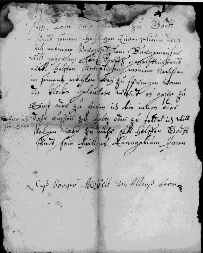 Ich Lobe und Swere [schwöre] zu Godt undt seinem Heyligen Evangelium daß ich meinem Vorgesetzten Burgemeister will gehorsam sein Dorfs gerechtigkeidt will helfen Verdetigen [verteidigen] meinem Nechsten in seinen nöhten bey zu springen wann die Klocke geleutet wirdt es gesche [geschehe] zu Ernst oder zu Storm ich bin innen oder dahr außen zu Holtz oder zu Felde wan ich sie höre ich will volgen wahr zu mihr soll helfen Godt [so wahr mir Gott helfe] undt sein Heiliges Evangelium Amen Daß Borger Aeydt von Alters herr