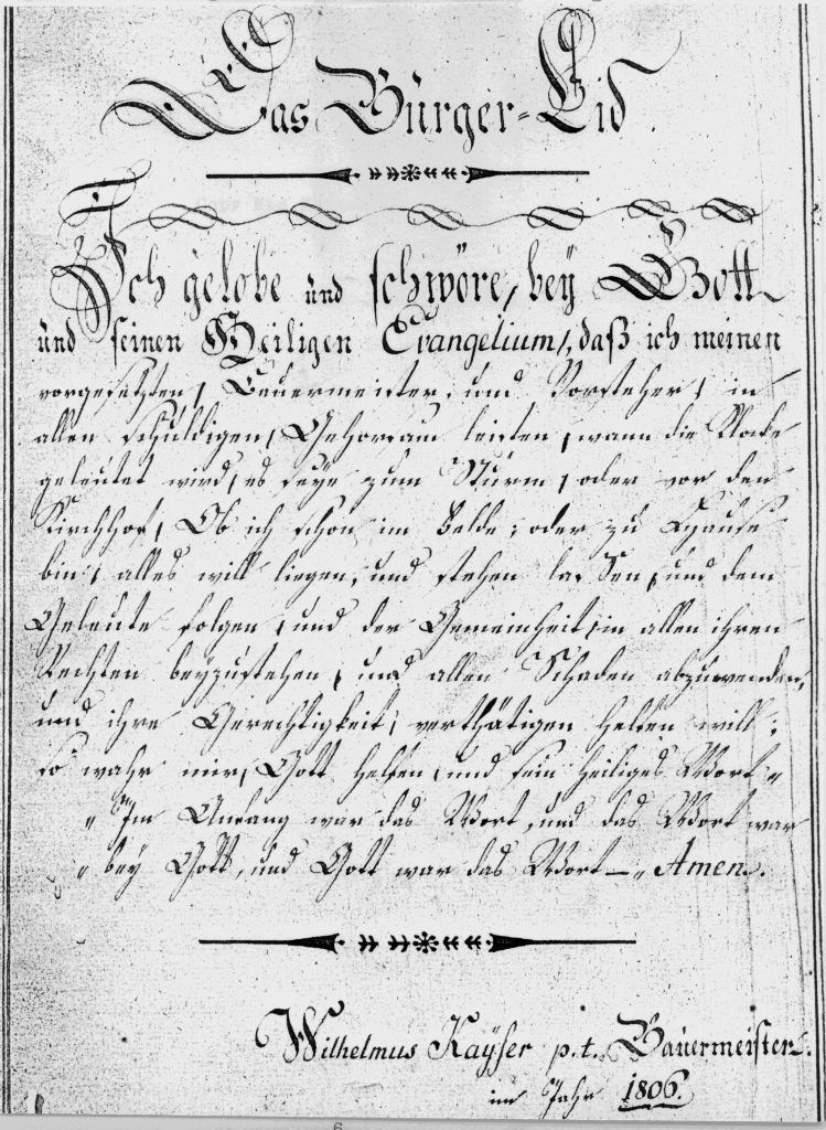 Das Bürger-eid. -----<->> >> * << <<->----- Ich gelobe und schwöre bey Gott und seinen Heiligen Evangelium, daß ich meinen vorgesetzten Bauermeister und Vorstehern in allen schuldigen Gehorsam leisten, wann die Klocke geleutet wird, es seye zum Sturm oder vor dem Kirchhof. Ob ich schon im Felde oder zu Hause bin, alles will liegen und stehen lassen und dem Geleute folgen und der Gemeinheit in allen ihren Rechten beyzustehen, und allen Schaden abzuwenden, und ihre Gerechtigkeit verthätigen helfen will; so wahr mir Gott helfen und sein Heiliges Wort: Im Anfang war das Wort, und das Wort war bey Gott, und Gott war das Wort_ Amen. -----<->> >> * << <<->----- Wilhelmus Kayser p.t.Bauermeister im Jahre 1806.