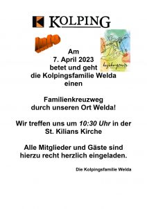 Am Karfreitag, den 07. April lädt die Kolpingsfamilie Welda zum Familienkreuzweg ein. Treffpunkt ist um 10:30 Uhr an der St.-Kilian-Kirche.