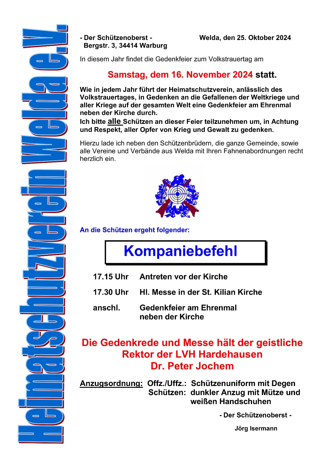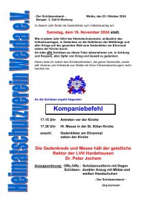 Der Heimatschutzverein Welda e.V. lädt am Vorabend des Volkstrauertages, am Samstag, den 16. November 2024 um 17:30 Uhr, die Bevölkerung von Welda zur Gedenkfeier an das Kriegerehrenmal ein.