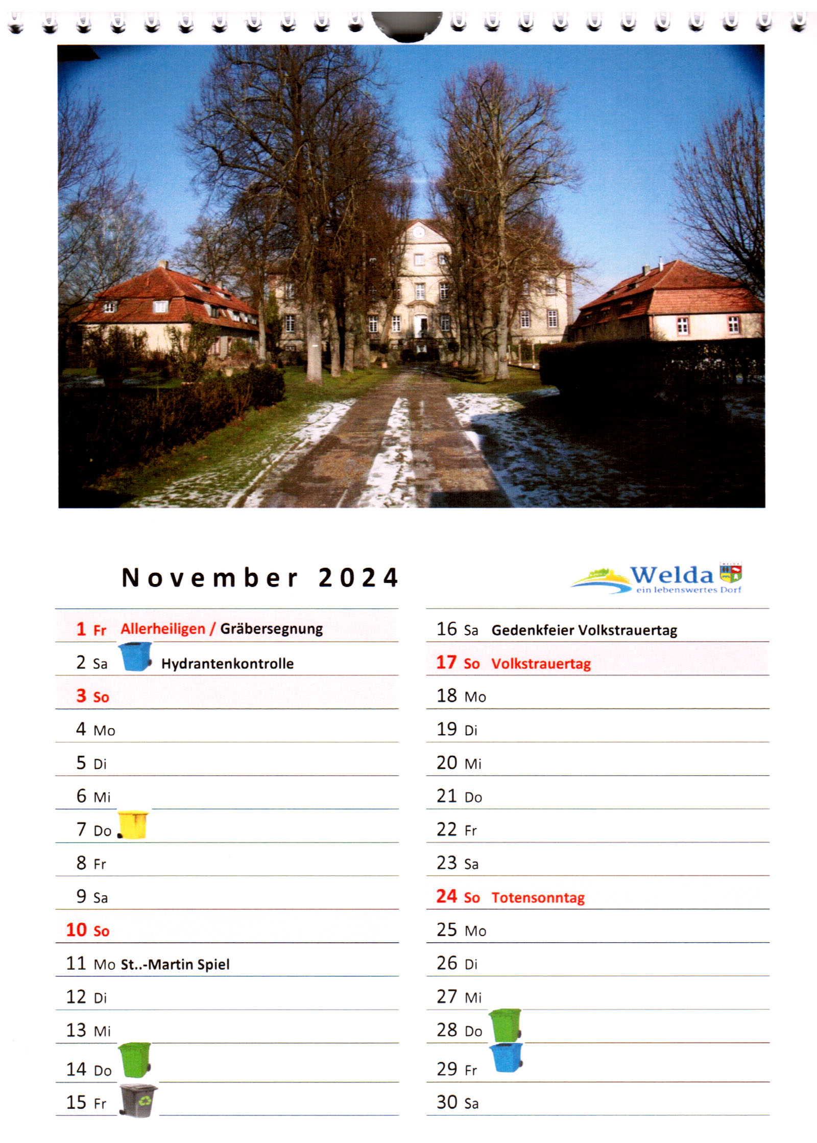 In diesen Kalender werden zudem die Termine der Veranstaltungen in Welda und die Termine der Müllabfuhr aufgenommen.