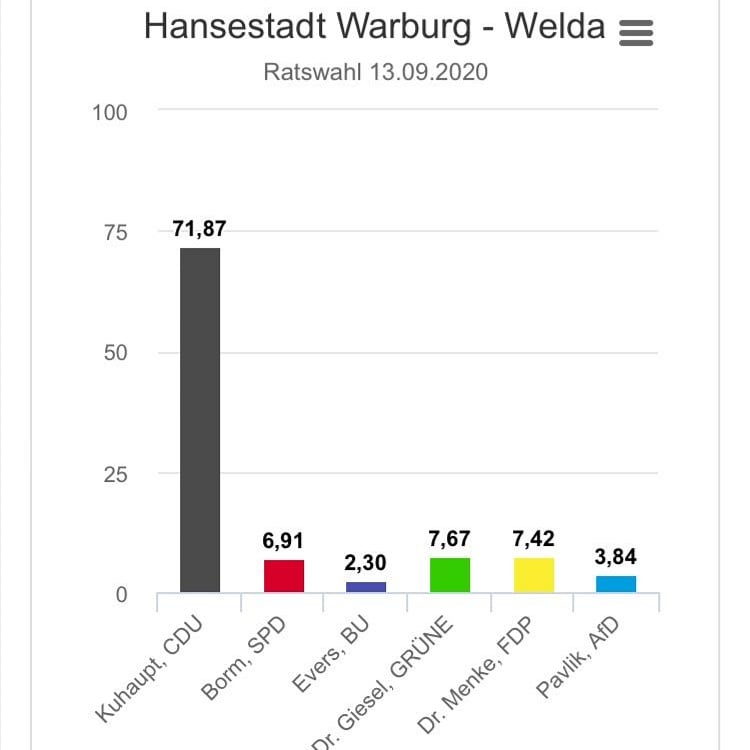 Hubertus Kuhaupt dankte in einer ersten Reaktion den Wählerinnen und Wählern in Welda für das Vertrauen in seine kommunalpolitische Arbeit. „Vor dem Ergebnis habe ich großen Respekt! Ich werde mich auch in den nächsten fünf Jahren mit ganzer Kraft für unser Dorf und unsere Heimatstadt Warburg einsetzen.“, versprach er abschließend.
