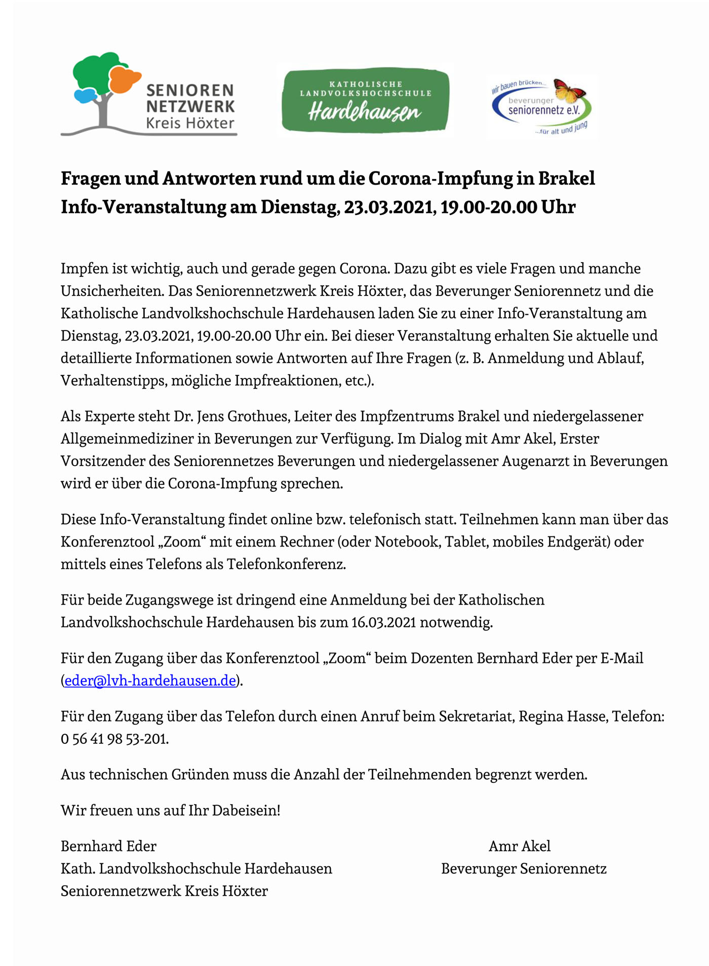 Seniorennetzwerk Kreis HöxterDas Seniorennetzwerk Kreis Höxter führt am Dienstag, den 23.03.2021, in der Zeit von 19.00-20.00 Uhr eine Infoveranstaltung zu Fragen rund um das Impfen gegen Corona durch. An dieser Veranstaltung kann man per Videokonferenz oder Telefon teilnehmen.     Infoveranstaltung Impfen gegen Corona