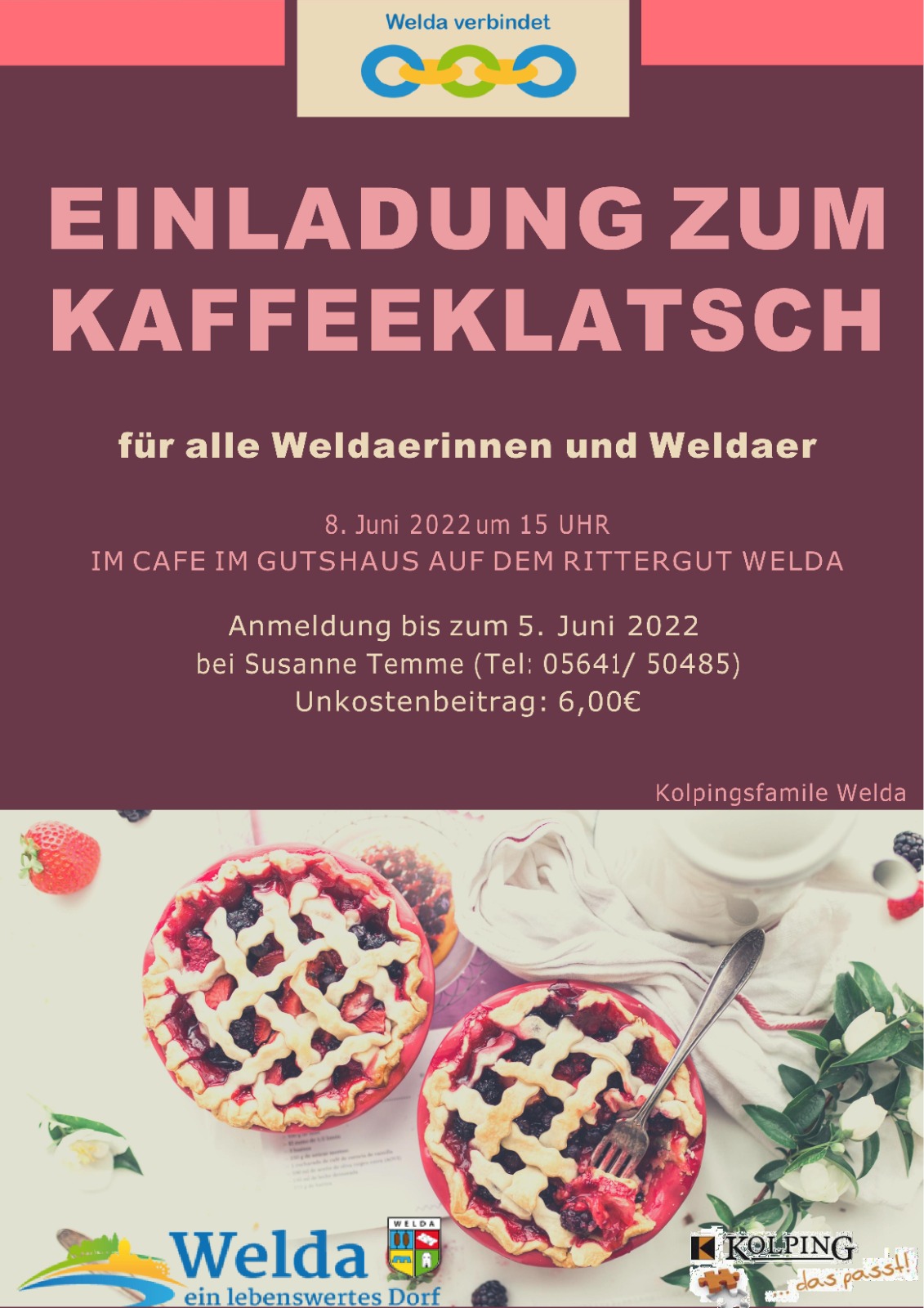 Die Kolpingsfamilie Welda veranstaltet den nächsten Kaffeeklatsch am Mittwoch, 8. Juni 2022, um 15 Uhr im Cafe im Gutshaus auf dem Rittergut in Welda.