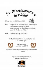 Die Kolpingfamilie Welda lädt herzlich zum St.-Martin-Spiel in die St- Kilian-Kirche ein.
