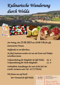 Die KFD Welda lädt am Freitag, den 25. August alle Interessierten Frauen zu einer kulinarischen Wanderung durch Welda ein.