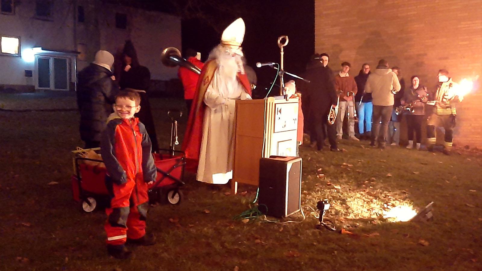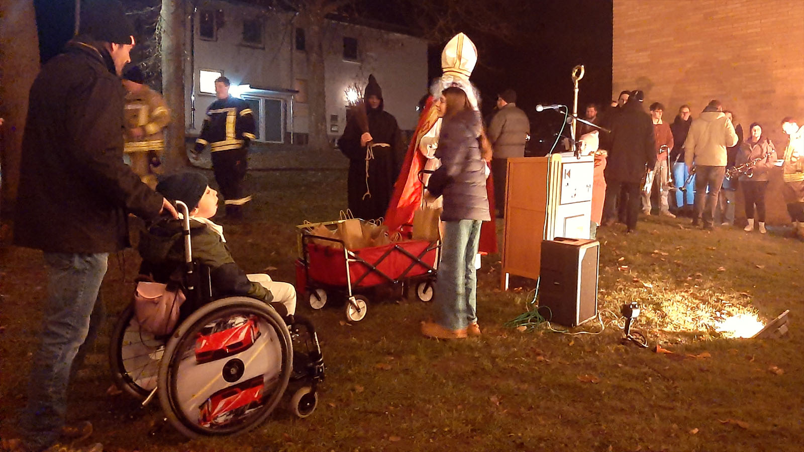Auf dem festlich hergerichteten Adventsmarkt, den viele fleißige Helfer errichtet hatten, richtete er seine Grußworte an die Gäste und die zahlreich erschienenen Kinder. Nach einer Geschichte verteilte er seine guten Gaben.