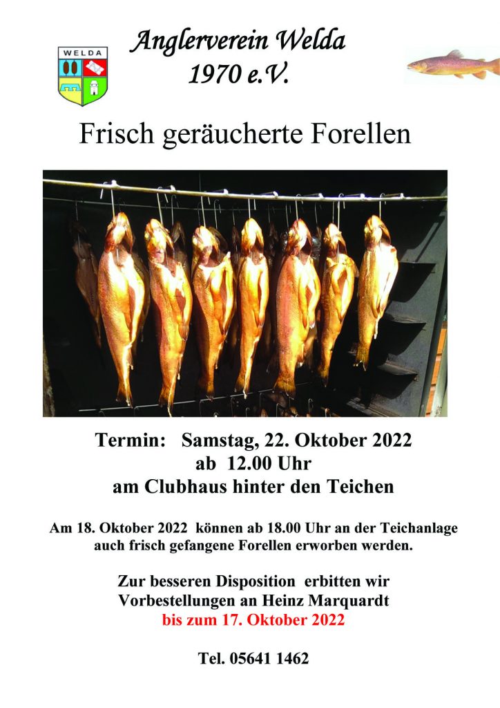 und am 8. November 2025 geräucherte Forellen am Clubhaus des Anglervereins erwerben.