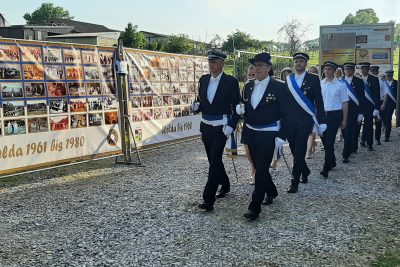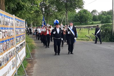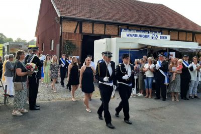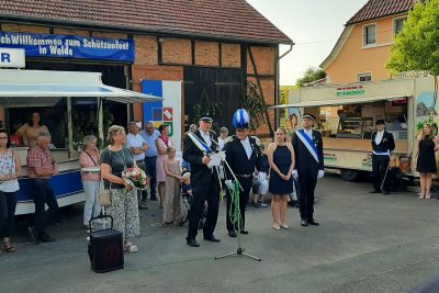 In ihren festlichen Uniformen und in Begleitung durchdringender Marschmusik, geleitete die Weldaer Schützenkompanie ihren König zusammen mit seinen Königsoffizieren feierlich durch den Ort zu Beckers Scheune, der ehemaligen DRK Unterkunft, wo bis vor 50 Jahren das traditionelle Königsschießen in Welda stattfand. Dort wurden sie bereits von vielen Gästen und Schaulustigen empfangen.