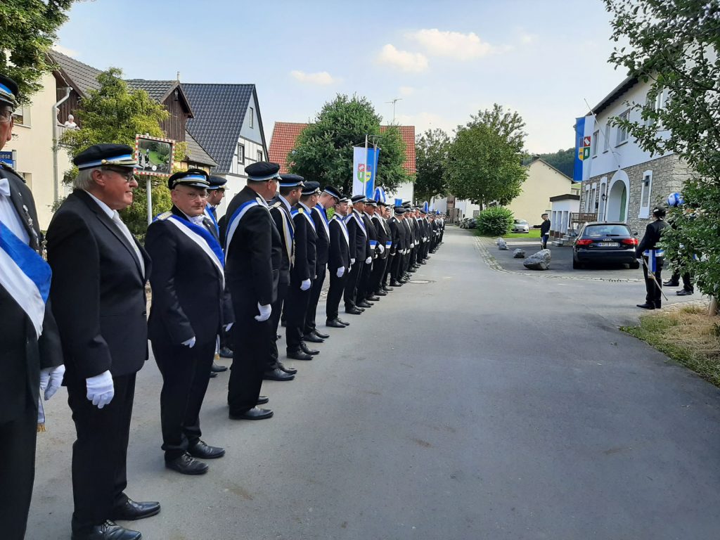 Nach der Schützenmesse mit anschließender Gefallenenehrung und traditioneller Kranzniederlegung setzte sich die Weldaer Schützenkompanie in Richtung Iberg-Halle in Bewegung. Das Königspaar Christopher Lücke und Lara Riebeling wurde dabei von ihrem Hofstaat flankiert.